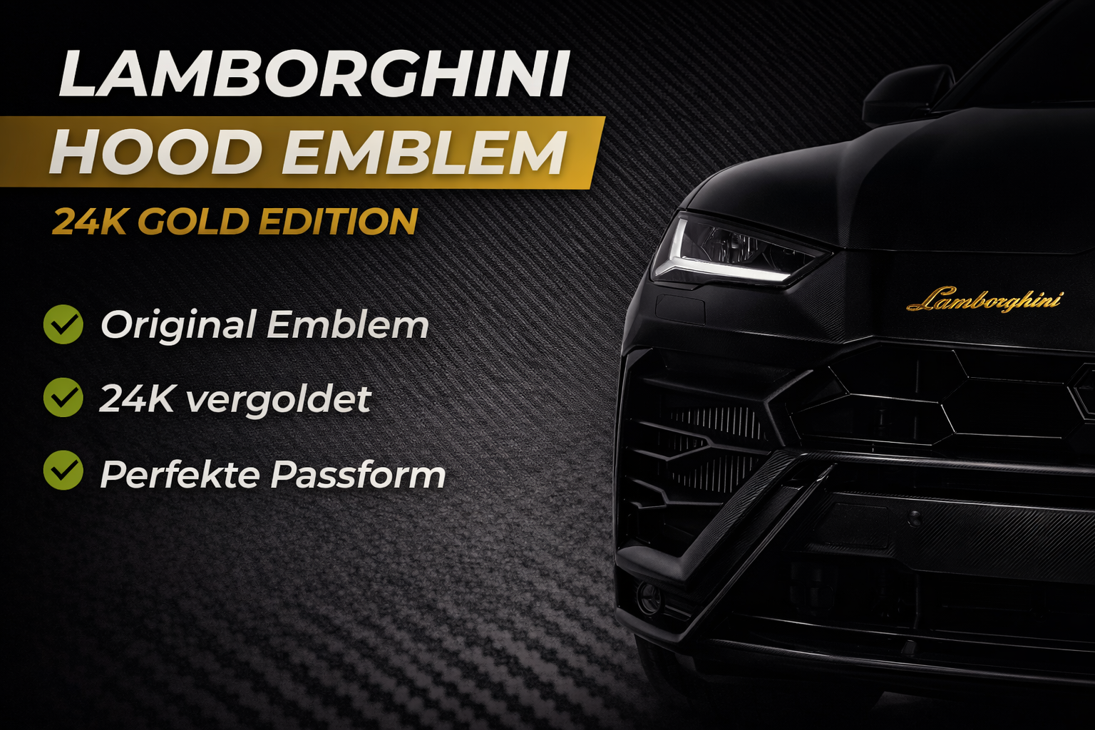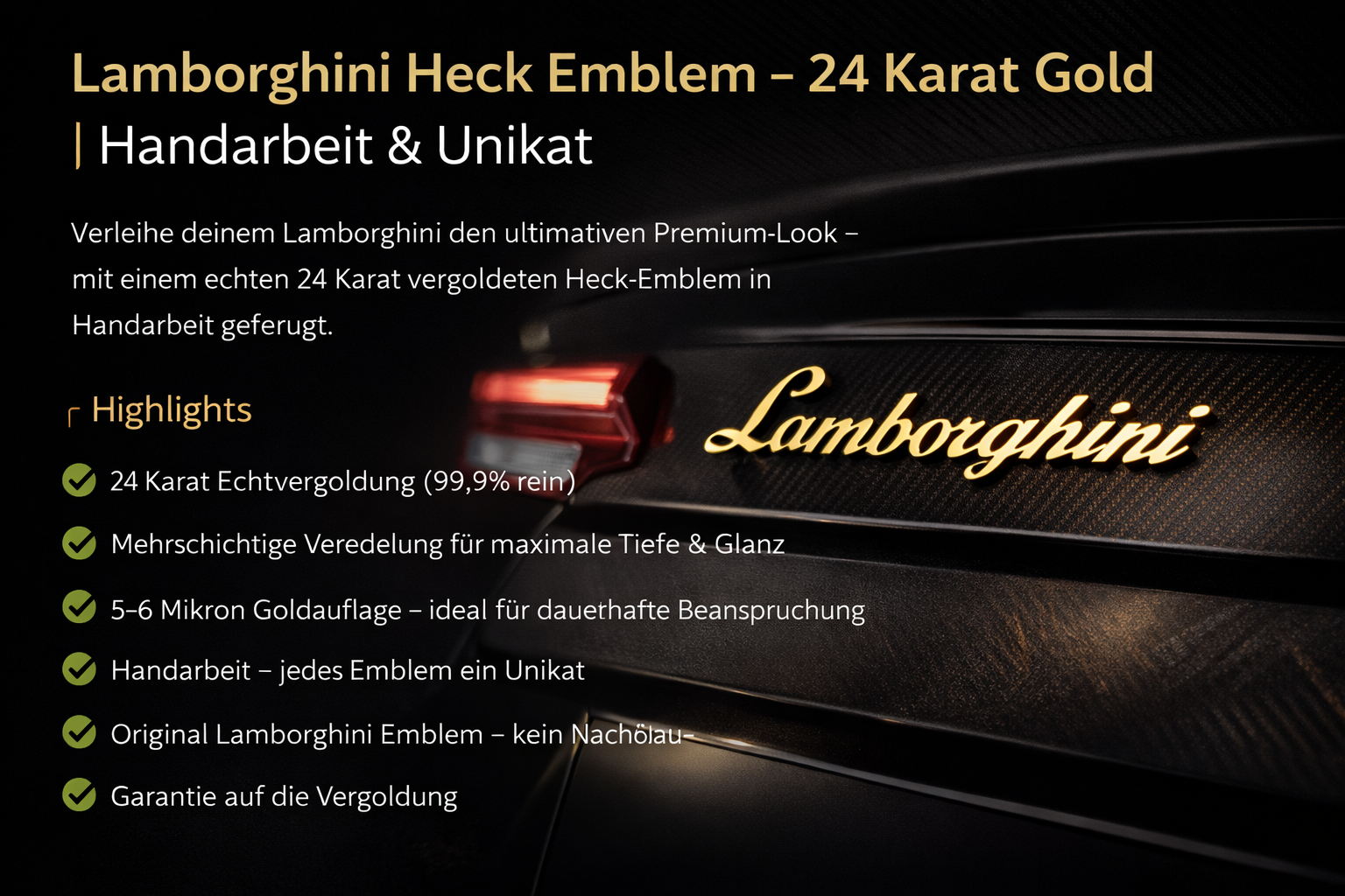 Verleihe deinem Lamborghini den ultimativen Premium-Look – mit einem echten 24 Karat vergoldeten Heck-Emblem in Handarbeit gefertigt.
