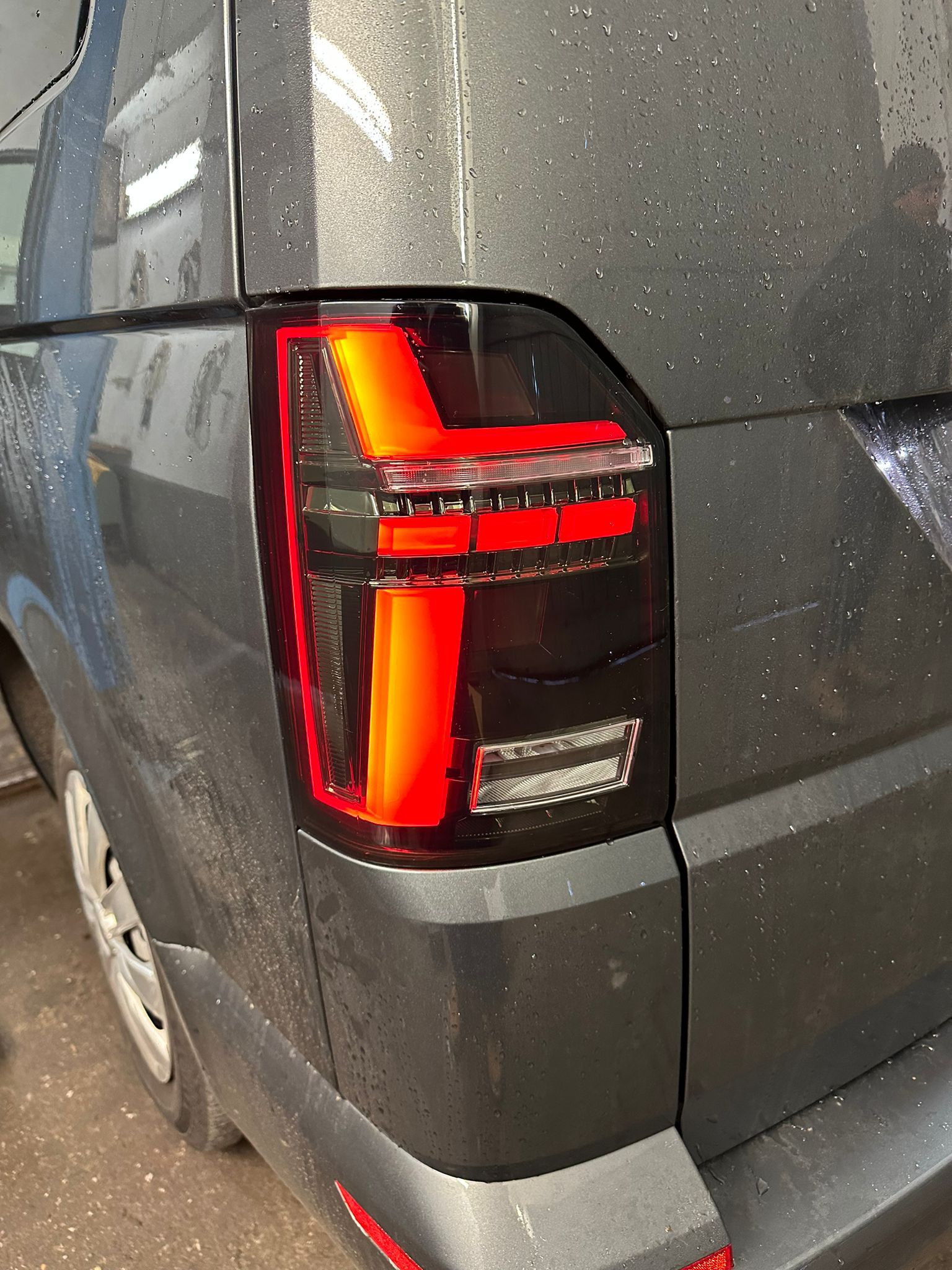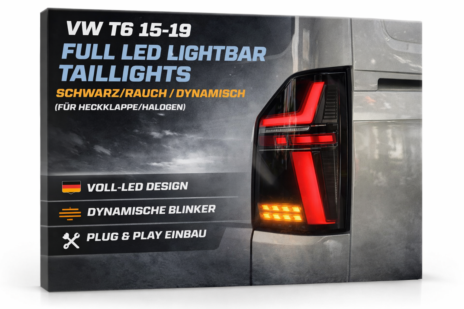Voll LED Lightbar Rückleuchten für VW T6 Modelle mit Heckklappe und mit werksseitigen Halogen Rückleuchten.