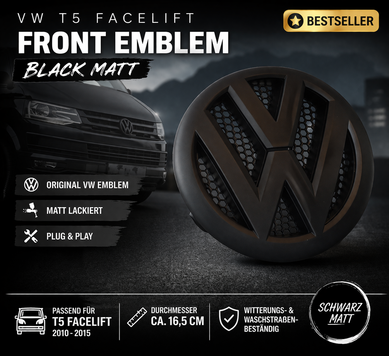 Upgrade your Volkswagen T5 with a clean and sporty OEM+ look – featuring our matte black refined front emblem.
